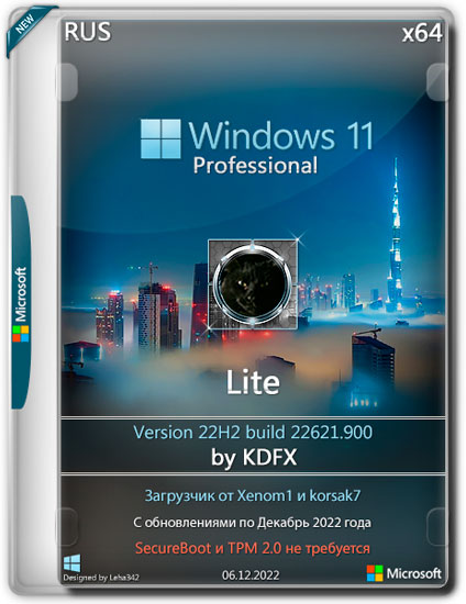 Легкая сборка была основана на оригинальном образе Windows 11 22H2. Интегрированы актуальные обновления, доступные на 4 декабря 2022 года. Удалена основная часть UWP (Appx, AppxBundle) приложений кроме Магазина с его зависимыми UWP, Камера, Калькулятор, Paint. Для обхода ограничений TPM и SecureBoot применён загрузчик от Xenom1 и korsak7. Подробнее читайте ниже.