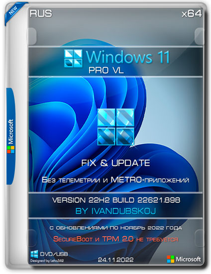 Авторская сборка Windows 11 Pro x64, без METRO-приложений, с отключенной телеметрией, службами, обходом ограничений - требований к TPM, SecureBoot, RAM и Storage и с актуальными обновлениями на 24 ноября 2022 года. Более подробнее о сборке читайте ниже.