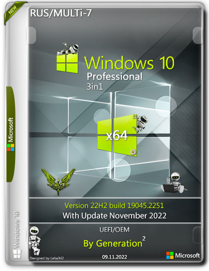 Сборка создана на основе оригинального образа Microsoft Windows 10 22H2 x64. В один образ объединены три редакции: две с автоактивацией и одна без. Интегрированы обновления по ноябрь 2022 года, билд повышен до 19045.2251. Системы абсолютно чистые. На начальном этапе есть возможность выбора редакции и одного из 7-ми языков устанавливаемой системы. Подробности ниже.