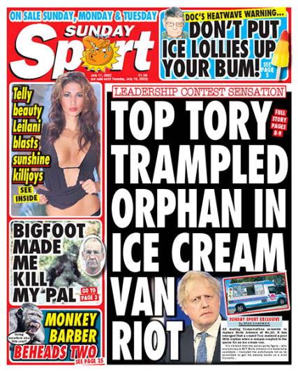 The Sunday Sport - британская таблоидная газета, опубликованная Sport Newspapers, которая была основана в 1986 году. В ней печатаются явно смехотворные истории, такие как «Двухэтажный лондонский автобус, был заморожен в антарктическом льду», или «Бомбардировщик Второй мировой войны, обнаружен на Луне» и «Инопланетяне превратили моего сына в рыбный палец». Она находит способы заставить страну смеяться и продолжает приносить вам самые смешные истории и самых красивых женщин. Защитники газеты указали, что это не должно восприниматься всерьёз.