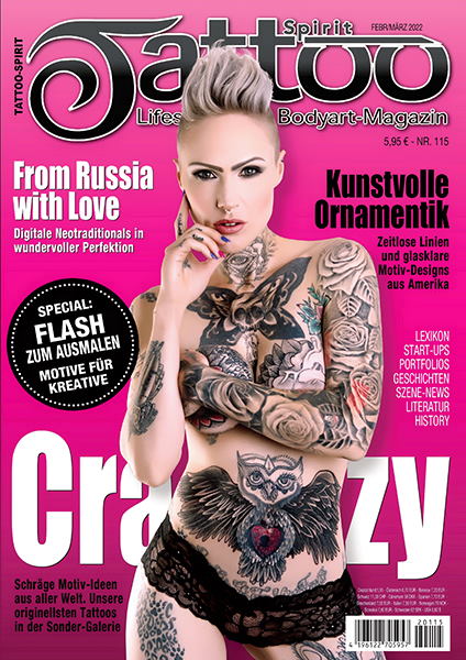 Журнал Tattoo Spirit выходит раз в два месяца в газетных киосках. Помимо тату-галерей с множеством шаблонов татуировок, преобладает редакционная зона. Здесь можно найти отчёты тату-студий и описания тату-конвенций, а также многочисленные тематические татуировки и изображения от самых разных мастеров, даты конвенций, советы по книгам, новости сцены, флеш-шаблоны, тату-стартапы и т. д. Tattoo Spirit - это руководство по сценам для всех, кто интересуется крутыми татуировками и связанными с ними второстепенными темами.